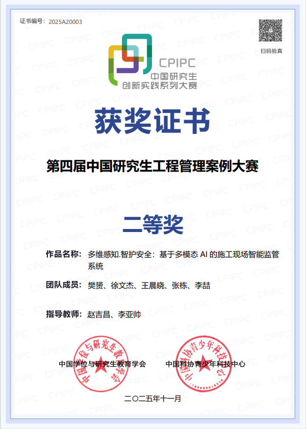 由北航经济管理学院李亚帅、赵吉昌老师指导,樊赟、徐文杰、王晨晓、张栋、李喆同学共同撰写的案例《多维感知·智护安全:基于多模态AI的施工现场智能监管系统》,荣获“重大系统研发”赛道决赛二等奖。