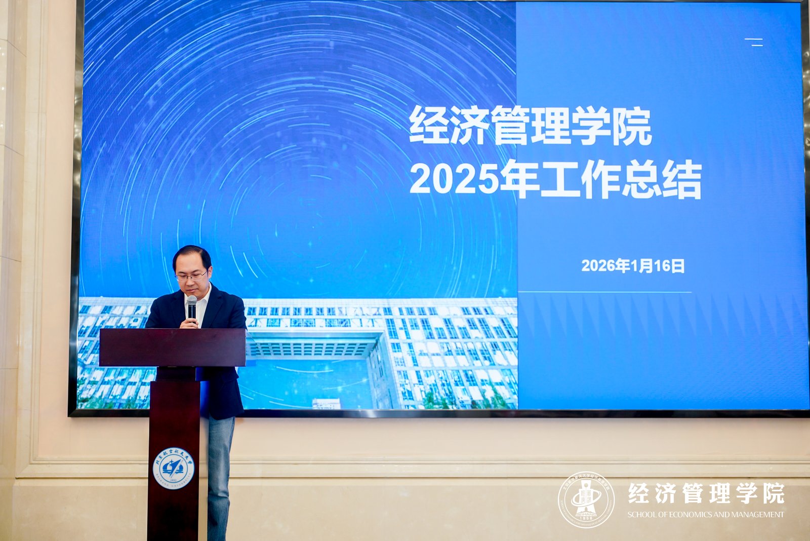 欢聚时光虽短,奋进征程可期。此次总结表彰大会全面回顾了学院2025年的发展成就,表彰了先进典型,凝聚了全院共识。新的一年,北航经济管理学院将继续秉持“数智领航 科创聚力”的理念,以更加昂扬的姿态、更加务实的作风,在人才培养、科研创新、社会服务等领域勇攀新高,为建设国际先进水平的经济管理学院而不懈奋斗!
