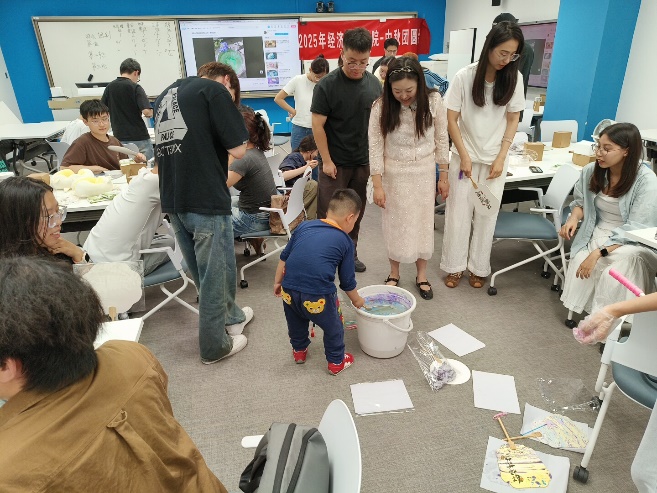随着夜幕降临,活动进入最后的“漆扇DIY”环节。各色颜料滴入水中,在涟漪中自然交融,再覆于扇面之上,晕染出一幅幅精美的图案纹样——这恰似性格各异、各有所长的同学们,怀揣着热忱汇入经管大家庭,携手勾勒出和谐温馨的集体画卷。同学们纷纷感叹道, “亲手体验这样的非遗技艺、完成一件独一无二的作品,这份成就感格外珍贵。”