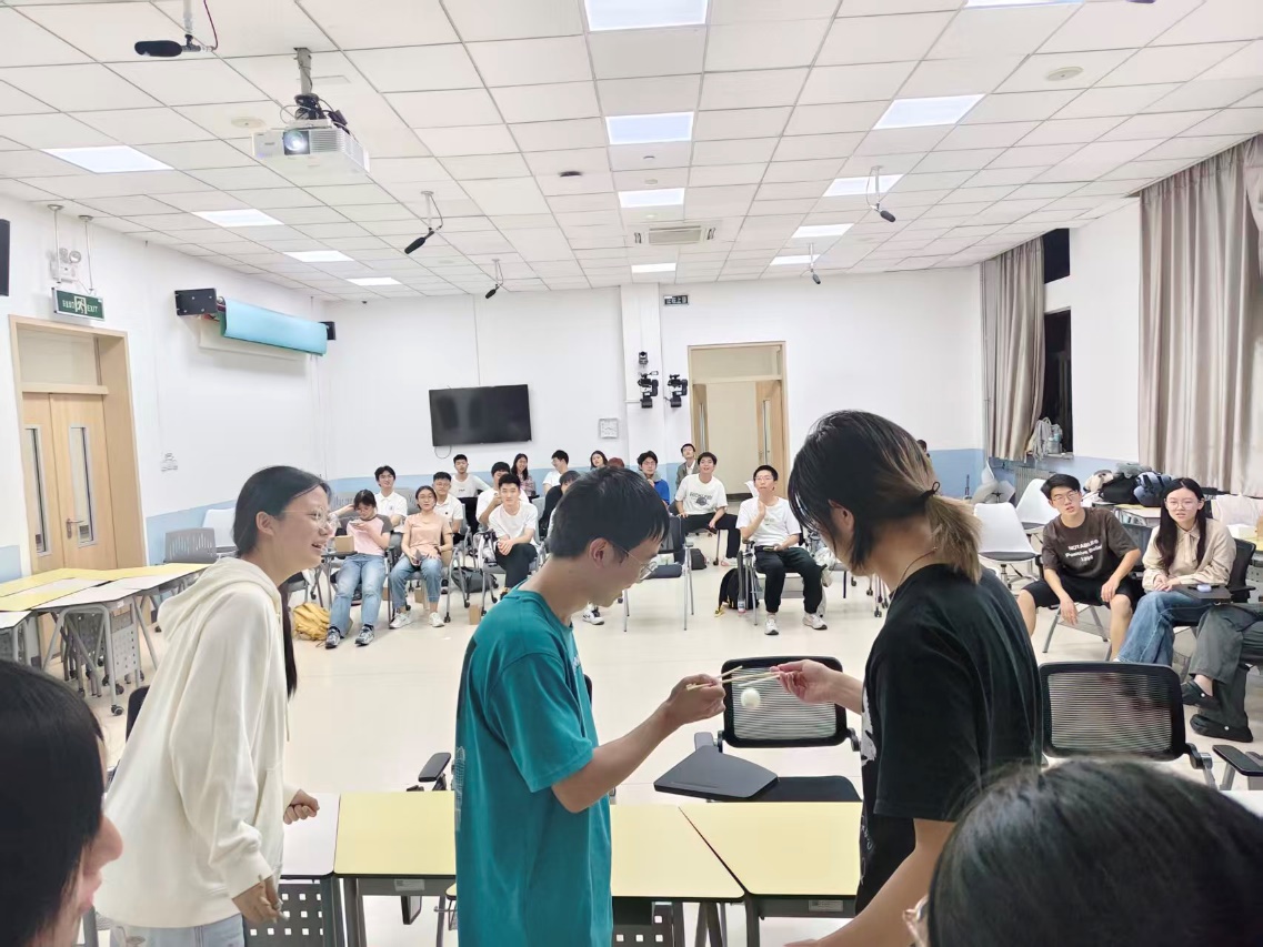 “玉兔传月饼” 环节将现场氛围推向顶峰。参与游戏的同学们需与小组伙伴凝心聚力、默契配合,手持筷子小心翼翼地将象征 “月饼” 的乒乓球从起点平稳传送至终点。小球 掉落的 清脆声响与同学们的笑声交织在一起,共同编织成一段鲜活而温暖的中秋记忆。