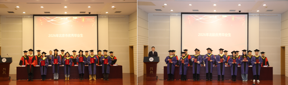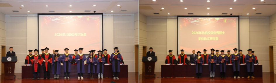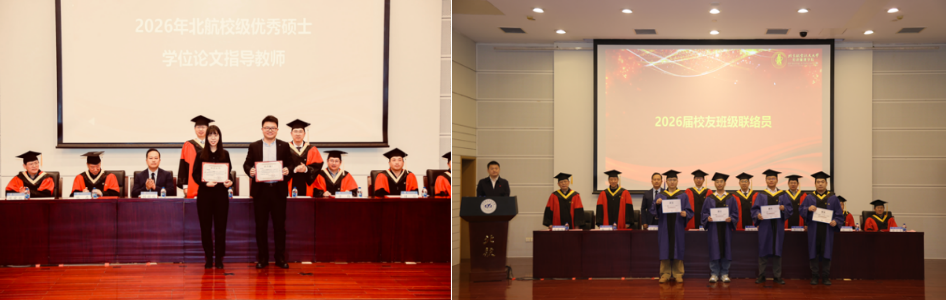 典礼在庄严的国歌声中拉开序幕。荣誉表彰环节,党委书记郑海涛宣读北京市优秀毕业生名单;副院长单伟宣读北航优秀毕业生名单;姚忠教授宣读校级优秀硕士论文获得者名单;谭小芬教授宣读校级优秀硕士论文指导教师名单;周荣刚教授宣读2026届校友班级联络员名单。在热烈的掌声中,受表彰的师生依次上台,接过象征荣誉的证书,将这值得铭记的时刻收入镜头。每一次定格,皆是求学路上熠熠生辉的勋章,为青春岁月镌刻下浓墨重彩的印记。