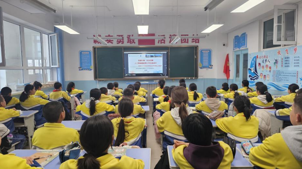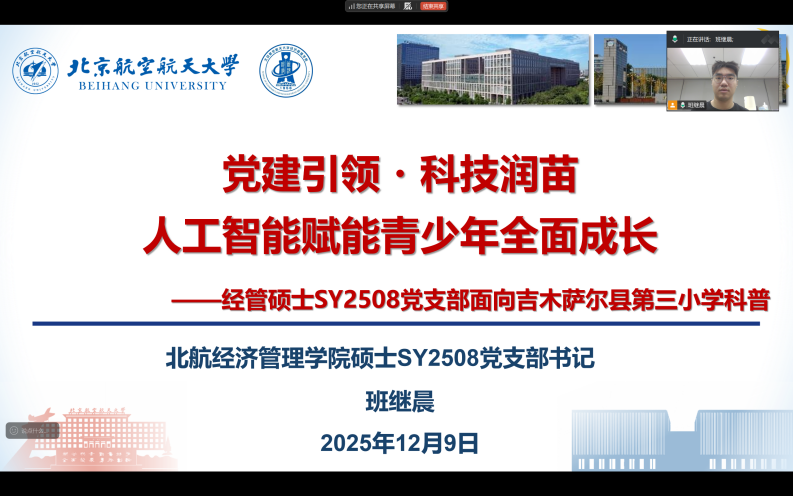 为深入践行党建引领教育帮扶使命,让偏远地区青少年近距离感受科技魅力、拓宽知识边界,2025年12月9日下午,北京航空航天大学经济管理学院硕士SY2508党支部联合北航第二十七届研究生支教团吉木萨尔分团,为新疆吉木萨尔县第三小学的同学们带来了一场主题为“人工智能赋能青少年全面成长”的科普宣讲。党支部书记班继晨担任主讲人,用生动通俗的语言为同学们开启了探索AI世界的大门。