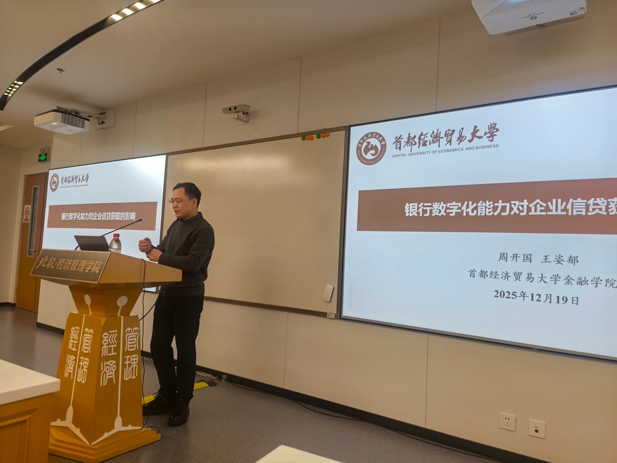 由北京航空航天大学经济管理学院金融系主办的“融实论坛”2025年第11期(总第78期)于2025年12月19日(周一)10:00-11:30,在北航学院路校区新主楼A618顺利举行。本期论坛邀请首都经济贸易大学金融学院周开国教授,做题为“银行数字化能力对企业信贷获取的影响”的学术报告。