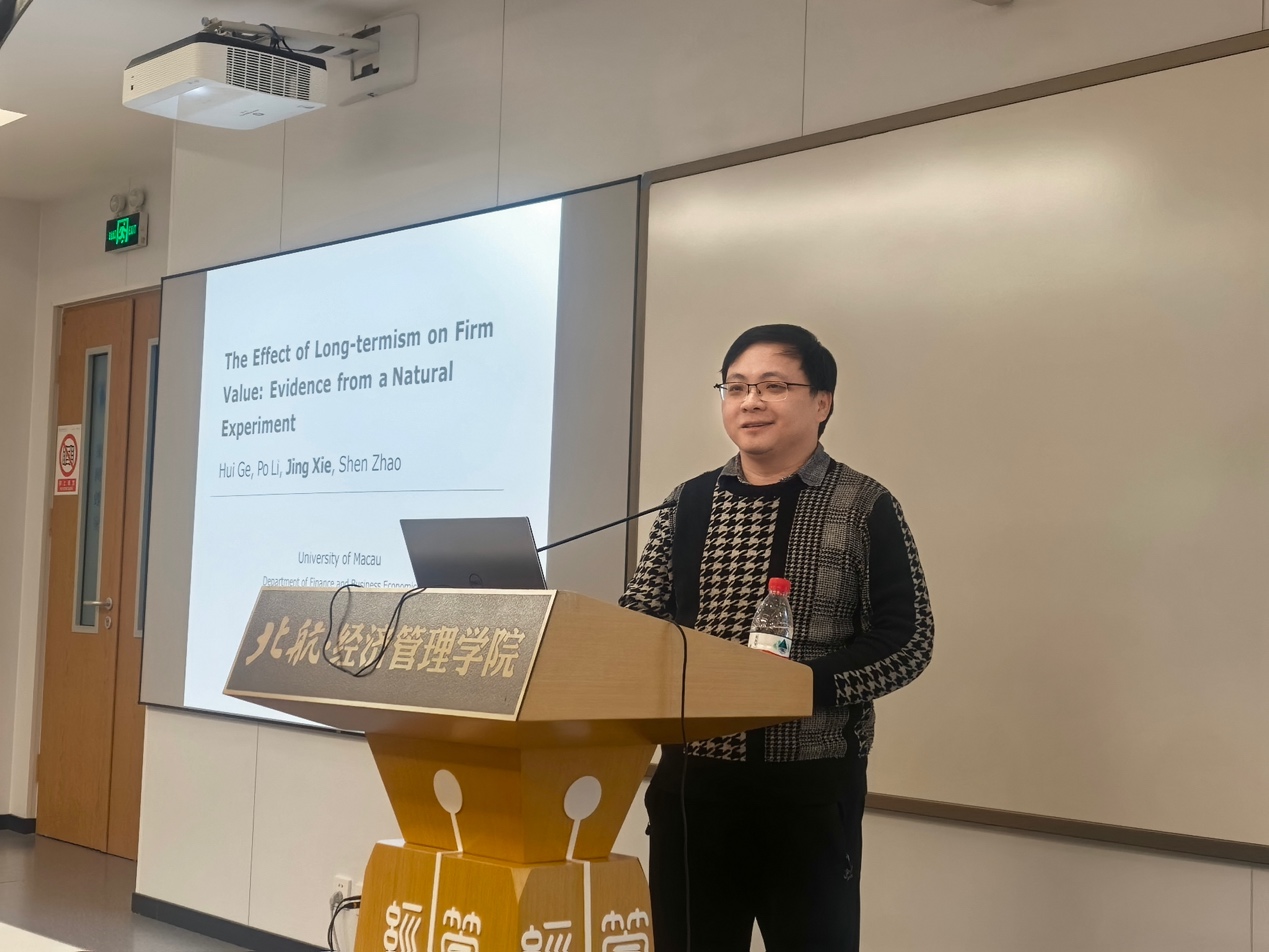 北京航空航天大学经济管理学院金融系“融实论坛”2025年第9期(总第76期)于2025年12月12日(周五)16:00-17:30在北航学院路校区新主楼A618顺利举行。本期论坛邀请到澳门大学金融学谢静副教授,做题为“The Effect of Long-termism on Firm Value: Evidence from a Natural Experiment”的学术报告。