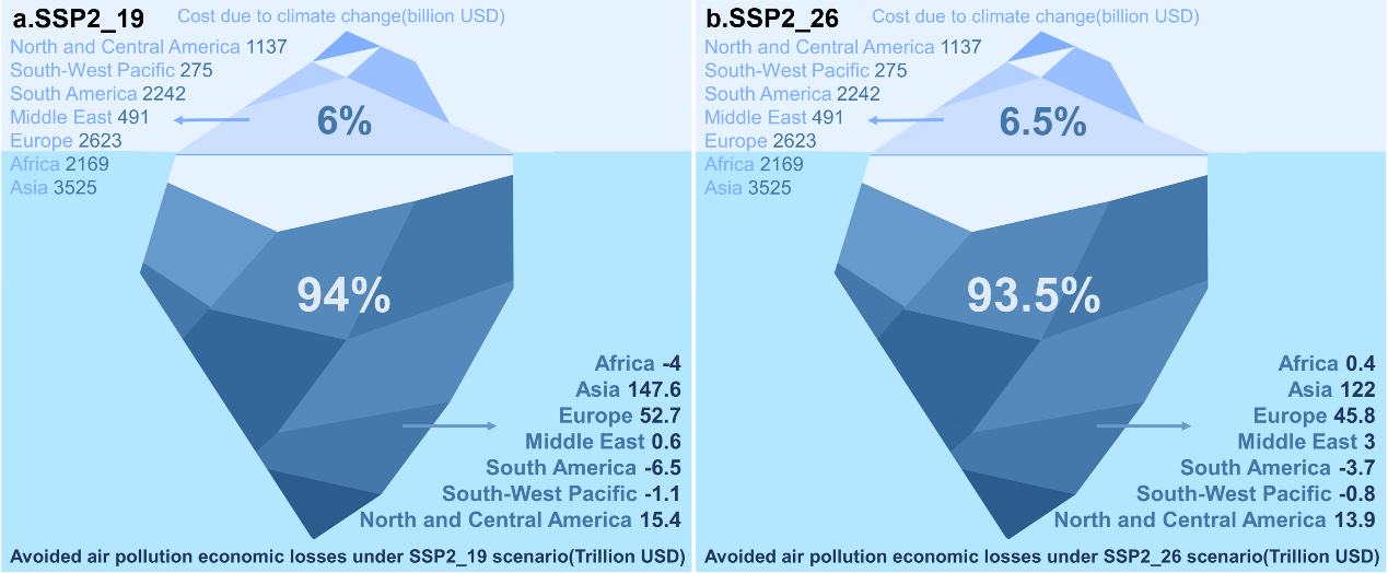 图6 2050年全球SSP2-1.9与SSP2-2.6情景下世界经济论坛(World Economic Forum)报告的气候变化经济损失及IMED|HEL模型测算的空气污染经济损失(a:SSP2-1.9情景;b:SSP2-2.6情景)