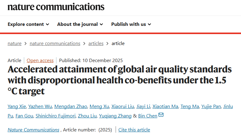 近日,由我院谢杨教授、北京师范大学陈彬教授及山东大学张玉强教授等研究人员合作完成的研究成果“Accelerated attainment of global air quality standards with disproportional health co-benefits under the 1.5 °C target”在国际顶级期刊《Nature Communications》发表。该研究首次系统评估了实现《巴黎协定》1.5°C气候目标对加速全球达成世界卫生组织(WHO)2021年空气质量指南(AQGs)的影响,揭示了气候韧性提升行动与空气质量管理的紧密协同效益。研究指出,当前各国气候承诺远不足以实现温控目标,更为积极的碳减排行动可以大幅提前空气质量达标的时间,带来更为可观的健康和经济效益。