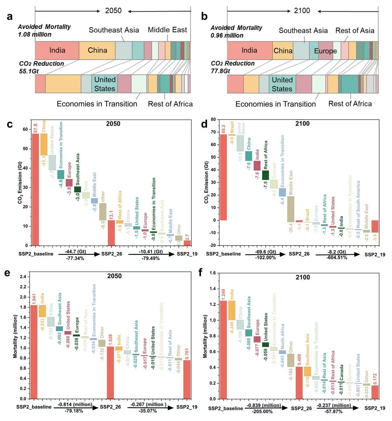 研究揭示了气候行动与健康协同效益之间存在明显的时间和区域错配:全球健康协同效益峰值出现在2050年;在区域贡献方面,2050年美国和中国是全球碳减排的主要贡献者,而到2100年,印度、转型经济体、西欧和非洲的贡献将更加均衡。从2°C目标提升至1.5°C目标,在2050年前可带来9.74-11.04万亿美元的额外净效益,但这一额外效益在2100年将略有下降,表明早期气候行动的健康回报更为显著。