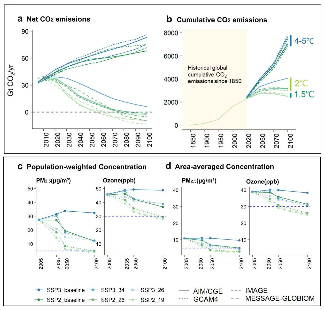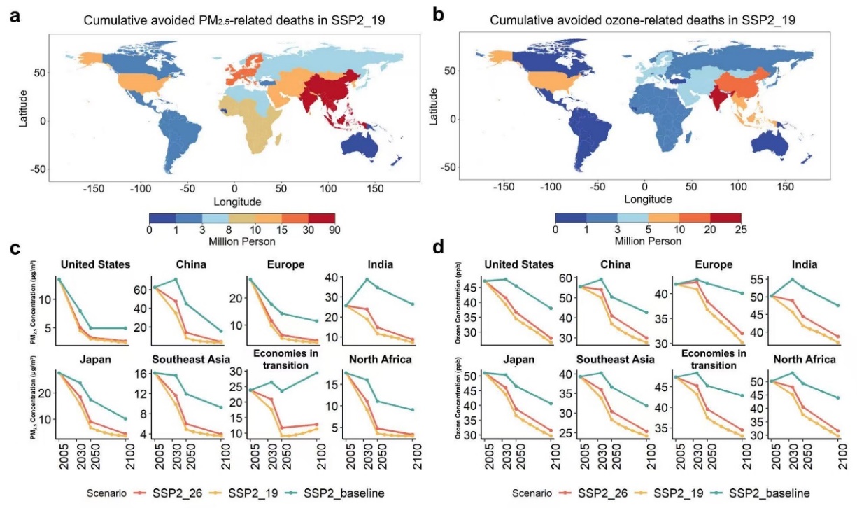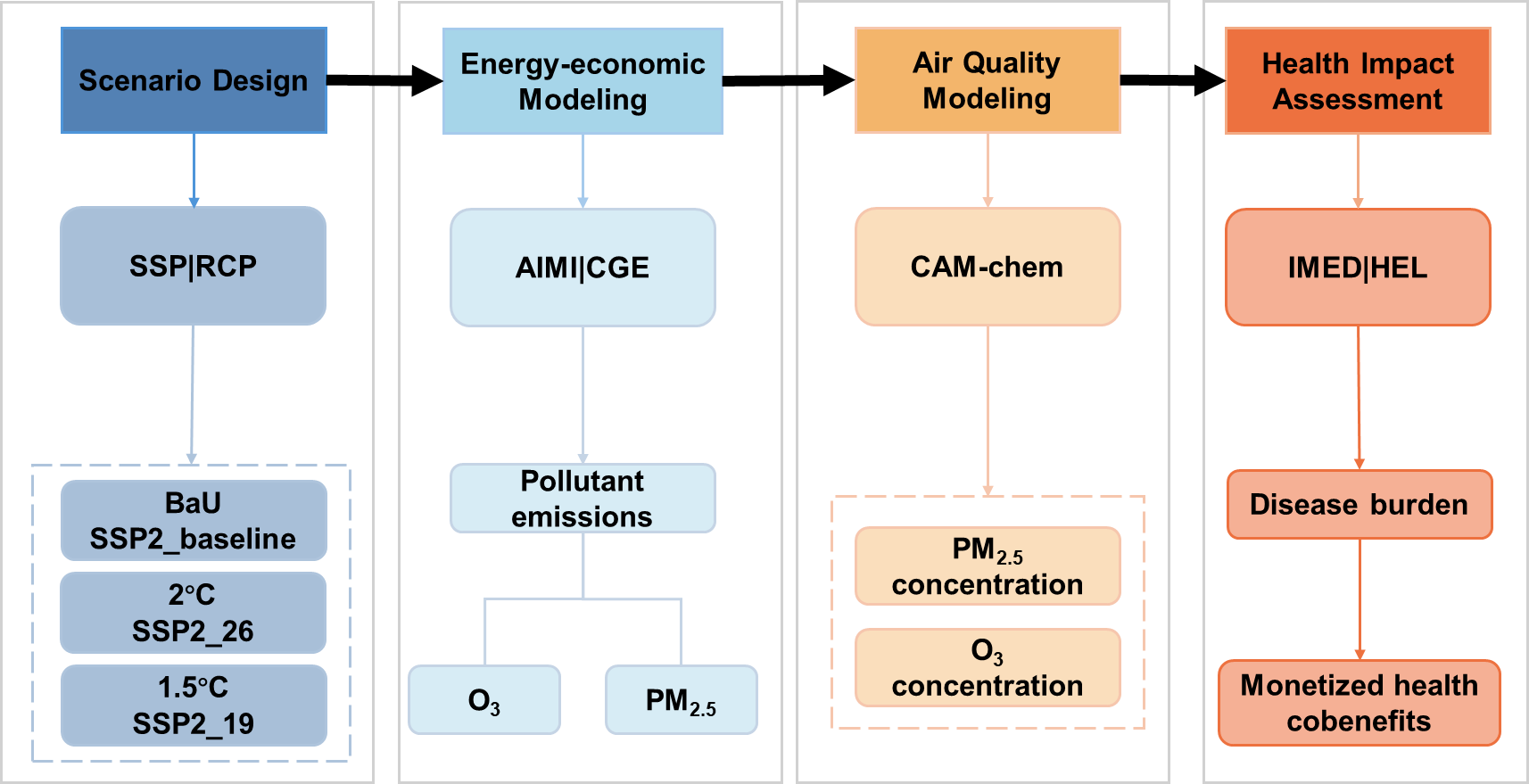 本研究构建了一套创新的综合评估建模框架,通过三个关键模块实现从政策到健康效益的全链条评估:AIM|CGE模型模拟全球经济活动与能源消费,预测温室气体和污染物排放路径;CAM-chem模型基于排放数据模拟全球PM2.5和臭氧浓度分布;IMED|HEL模型则量化空气污染对健康的影响并进行货币化评估。研究设计了三种情景——无气候约束的基准情景(SSP2_baseline)、2°C目标情景(SSP2_26)和1.5°C目标情景(SSP2_19),以对比分析不同路径下的空气质量改善时间表和健康效益。