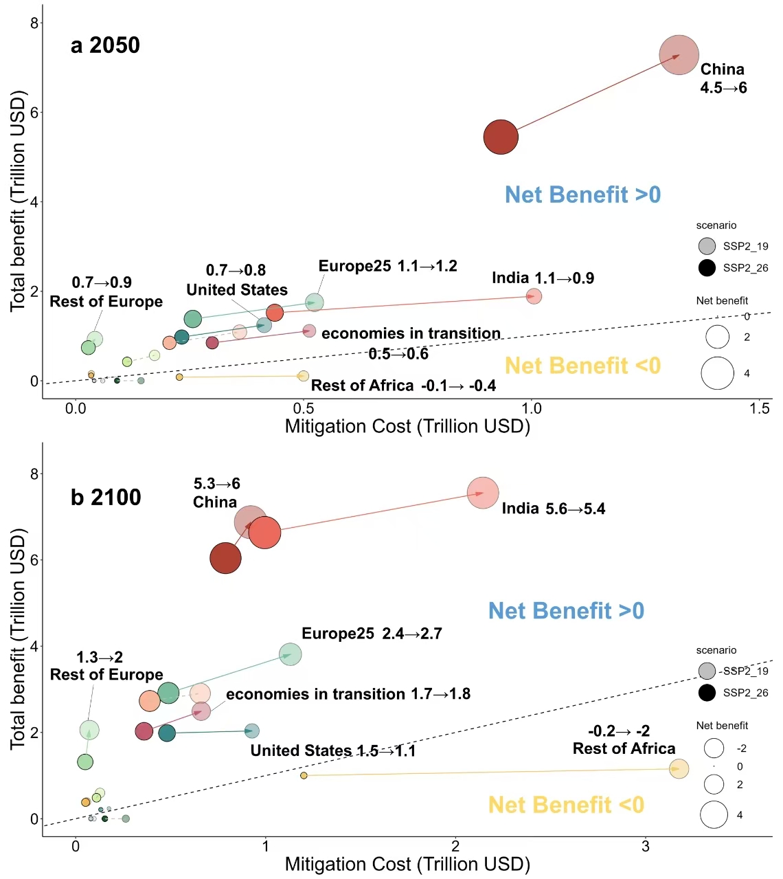 研究证实,雄心勃勃的气候行动在经济上是可行的,健康协同效益可抵消甚至超过减缓成本。美国、中国、印度、欧洲和东南亚将获得80%以上的全球净效益,而加拿大、巴西、大洋洲、拉丁美洲和非洲的净效益接近零或为负。与世界经济论坛数据对比显示,2050年空气污染缓解带来的健康经济损失避免是气候变化经济损失的16.5倍(1.5°C情景)和14.5倍(2°C情景),亚洲地区既面临最高的空气污染健康损失,也承受着最严重的气候变化经济损失。