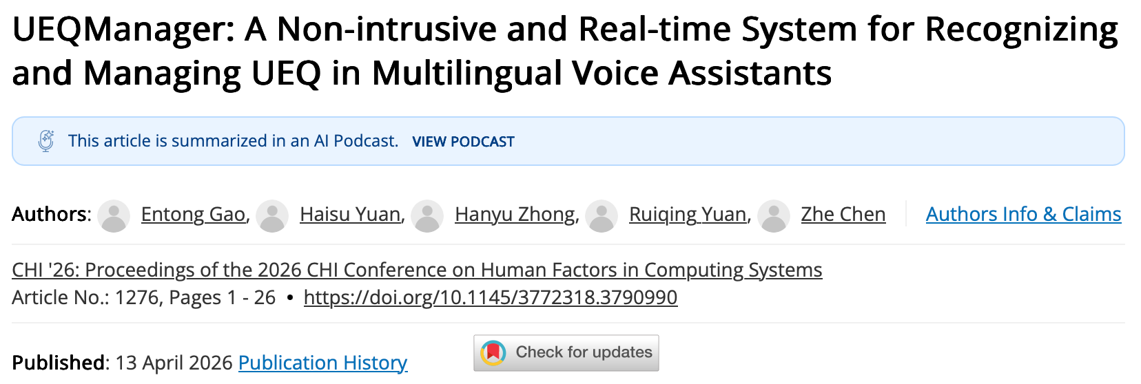 本次会议以Creant el demà junts(携手共创未来)为主题,于2026年4月13—17日举办,是全球人机交互领域规模最大、影响力最强的顶级学术会议,位列中国计算机学会(CCF)推荐A类会议。大会共设论文、海报、互动演示、专题、研讨会、学术交流会六大板块,全球累计投稿6730篇,最终录用论文1702篇,录用率仅25.3%,汇聚了全球学术界与产业界顶尖专家、学者及青年研究者共同交流前沿成果。