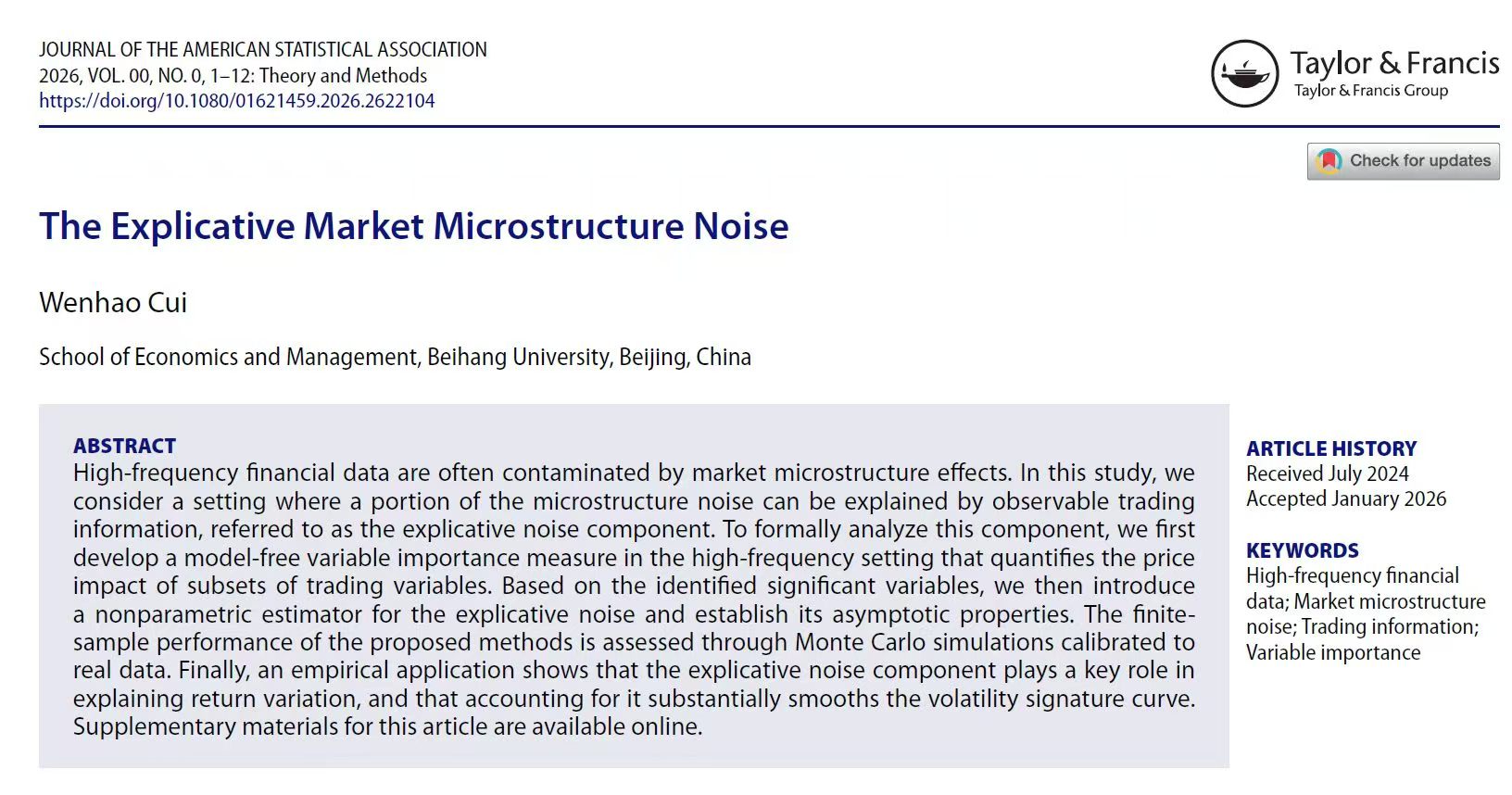 近日,北京航空航天大学经济管理学院崔文昊老师在国际顶级统计学期刊《Journal of the American Statistical Association》(JASA)上发表题为《The Explicable Market Microstructure Noise》(可解释市场微观结构噪声)的研究论文。该期刊作为美国统计学会的会刊,涵盖统计理论、方法及应用等多个方向,长期以来享有较高的学术影响力,是统计学领域的顶级期刊之一。高频金融数据(如股票逐笔交易数据)在提升市场透明度与预测...